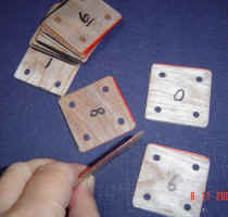 Mine nye brikker. De første 2- nærmest linealen - er lavet af hvalben De næste 2 - i midten - af ben fra moskusokse De sidste 2 - af læder Håber snart, jeg kan sætte nye billeder ind af Gedeskindsbrikker !!!! (ja - se ovenfor) (maj 2009) |