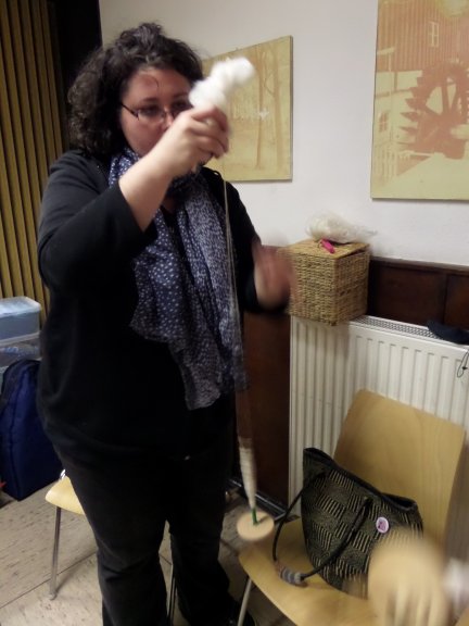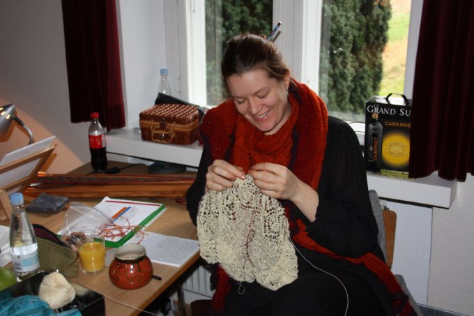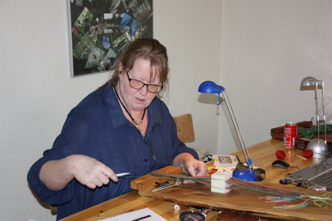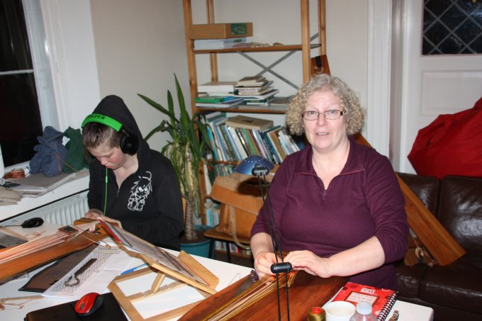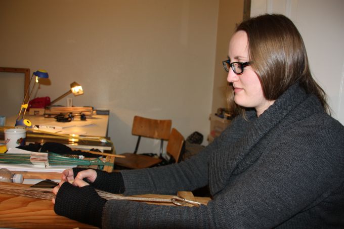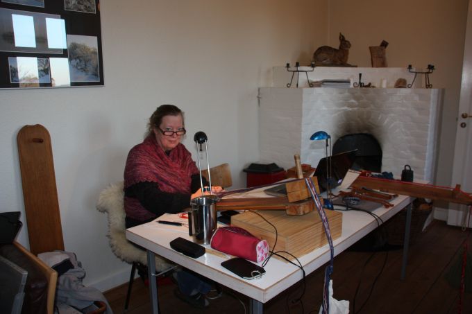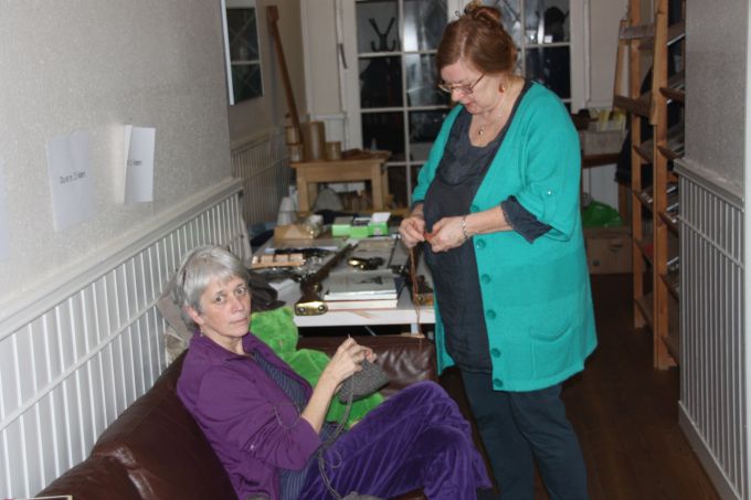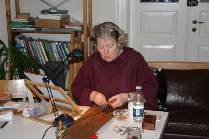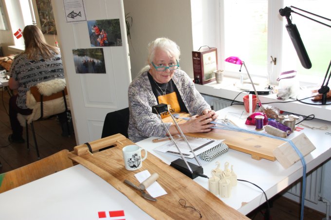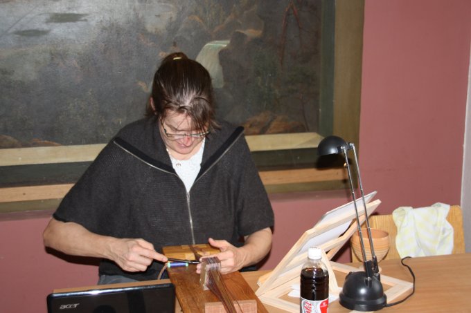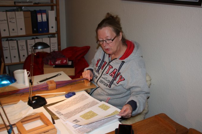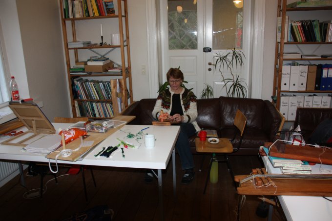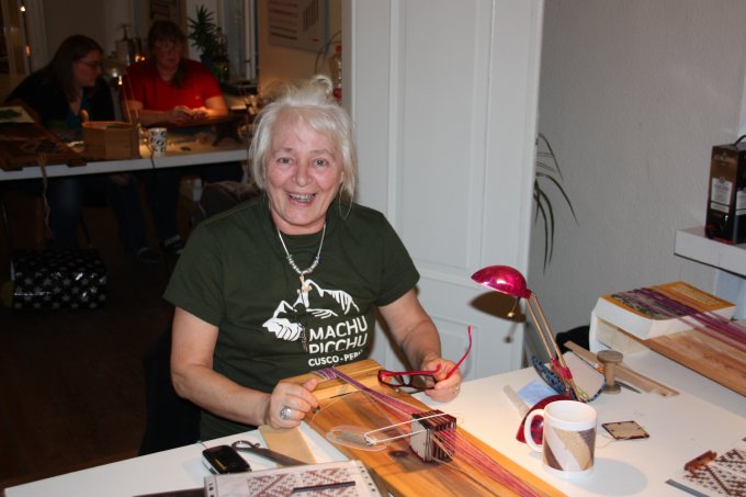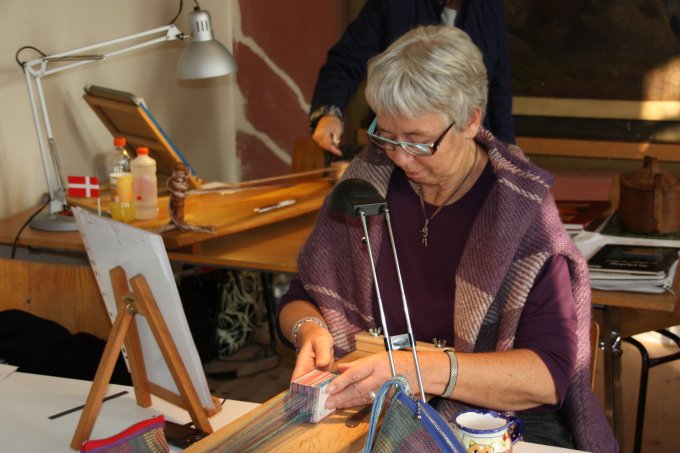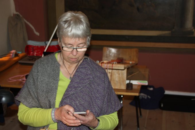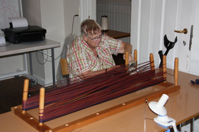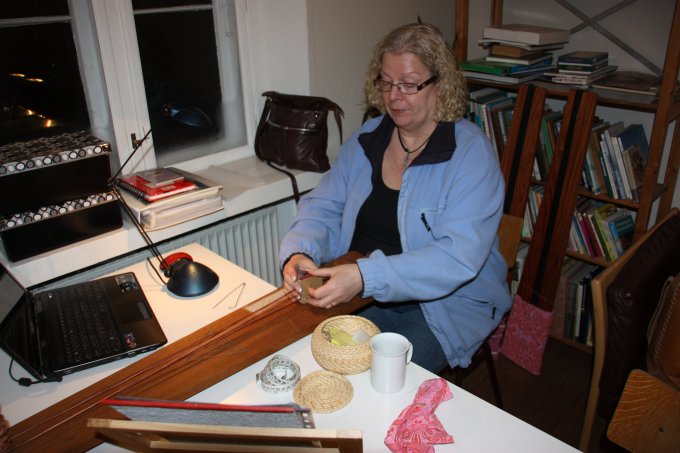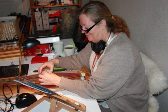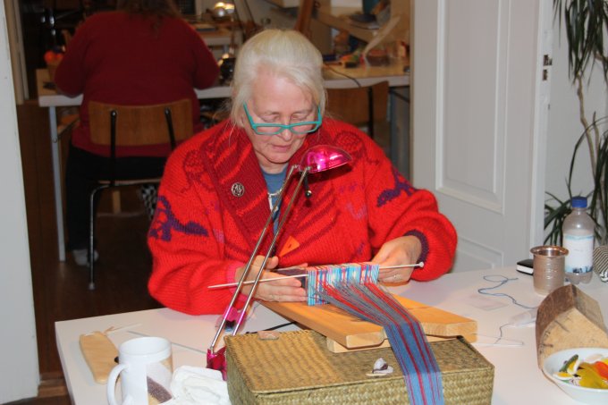| Joan starter altid, få minutter efter hun er ankommet med at væve. Og ser ud til at hygge sig dermed. | |||||||||||||||