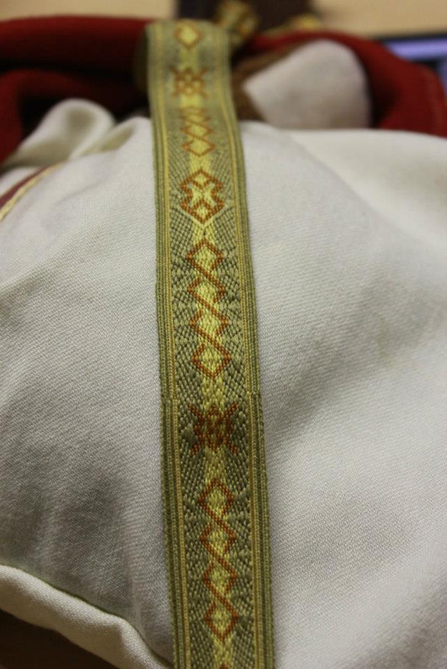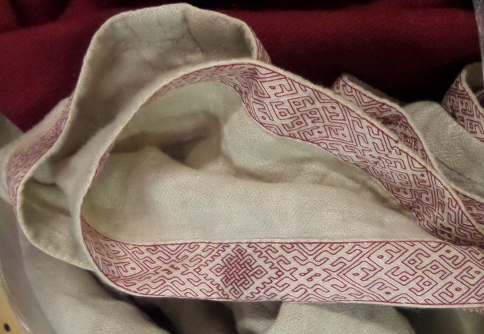 | Museet havde henvendt sig til mig for at låne et sølvbånd, da de havde fundet en lille smule sølvtråd, som kunne være rest af et brikbånd. Jeg havde et lille Birkabånd, som de lånte til deres udstilling. Her smukt monteret på en kvindefigur, lagt i en vognfadding.. | |||||||||||||||